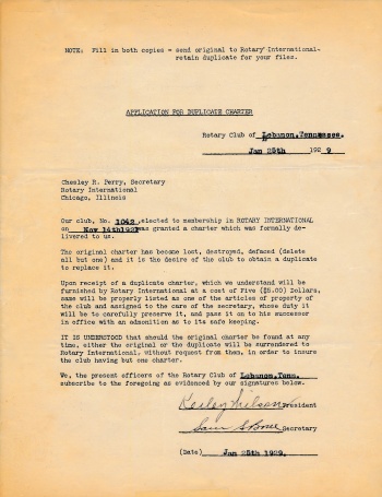 January 21, 1929 letter to Rotary International requesting a duplicate charter. Original was lost in fire at the Chamber of Commerce (club's meeting space) in the Arcade on the Square. See response below.