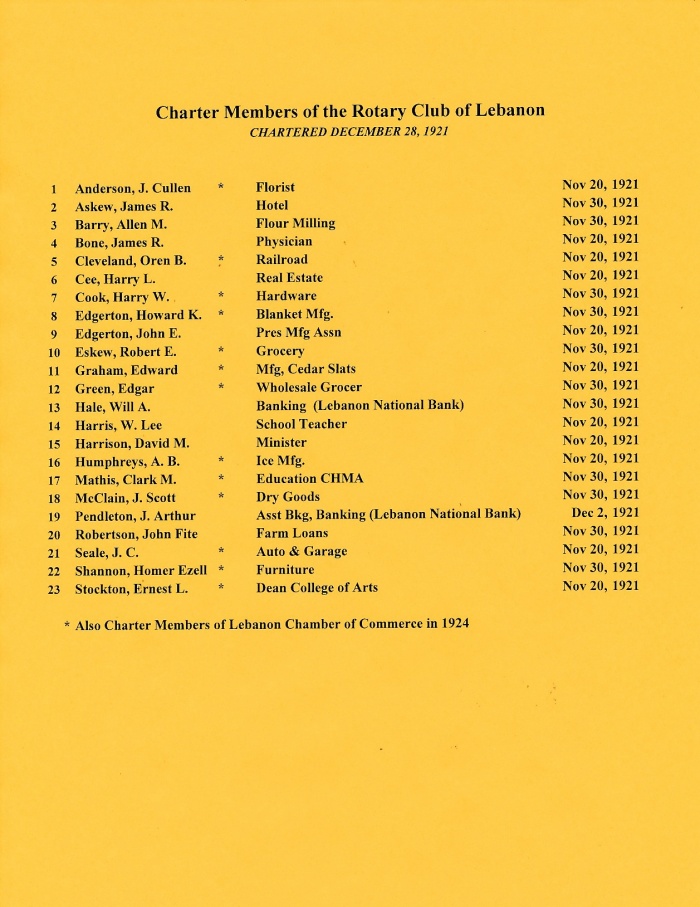 The Rotary Club of Lebanon, with the Exchange Club, the local American Legion post and the Lebanon Chamber of Commerce sponsor/charter the first Boy Scout troop in Lebanon and Wilson County (July 23, 1927). |
