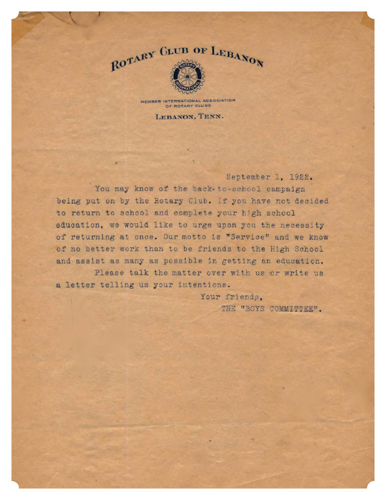 September 1, 1922 letter to Lebanon boys urging them to stay in school. |