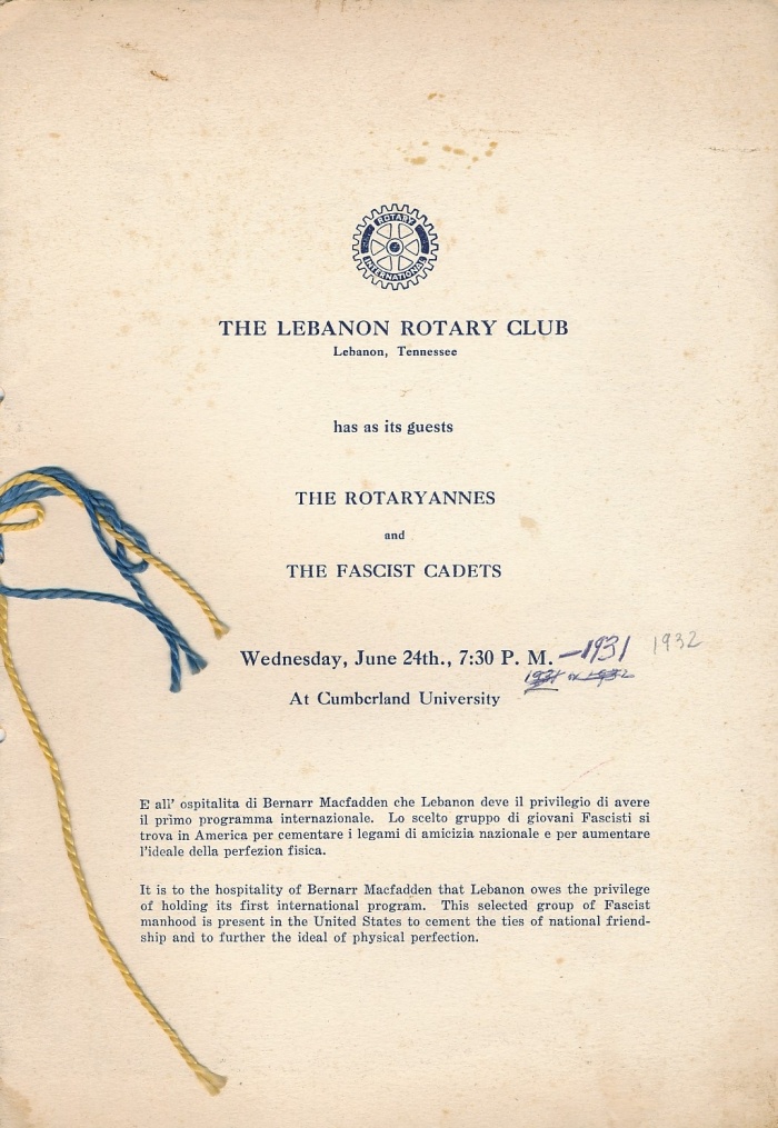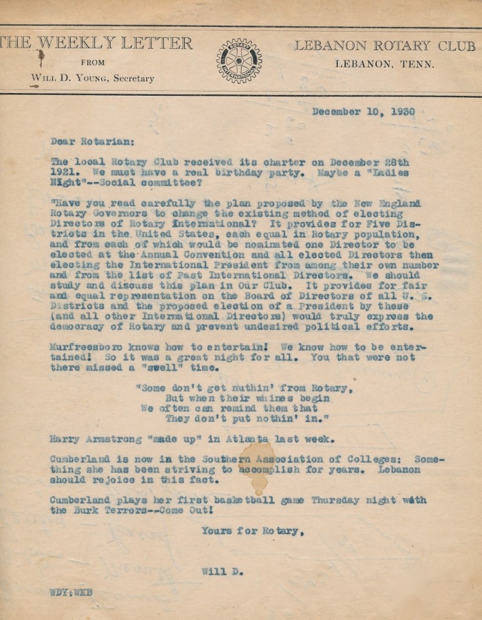The Club's "The Weekly Letter", dated December 10, 1930. Note that a "Ladies Night" is proposed to celebrate the club's upcoming 9th birthday. An annual "Ladies Night" became an annual tradition until women became club members in August 1996. Also note in the "Letter" that Cumberland University had recently joined the "Southern Association of Colleges". |