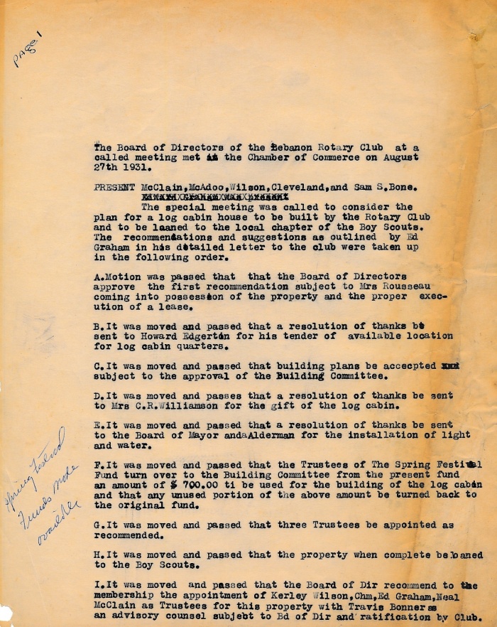 Board resolution to record that on August 27, 1931, the Club's Board of Directors approved a plan to fund the building of or acquiring a log cabin which would then be loaned to the local chapter of the Boy Scouts for their use. Page 1 above; page 2 is below. |