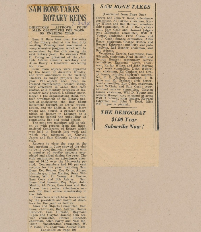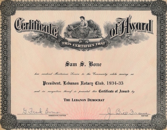 Meritorious Service Award to Sam S. Bone from the Lebanon Democrat (1934-1935).