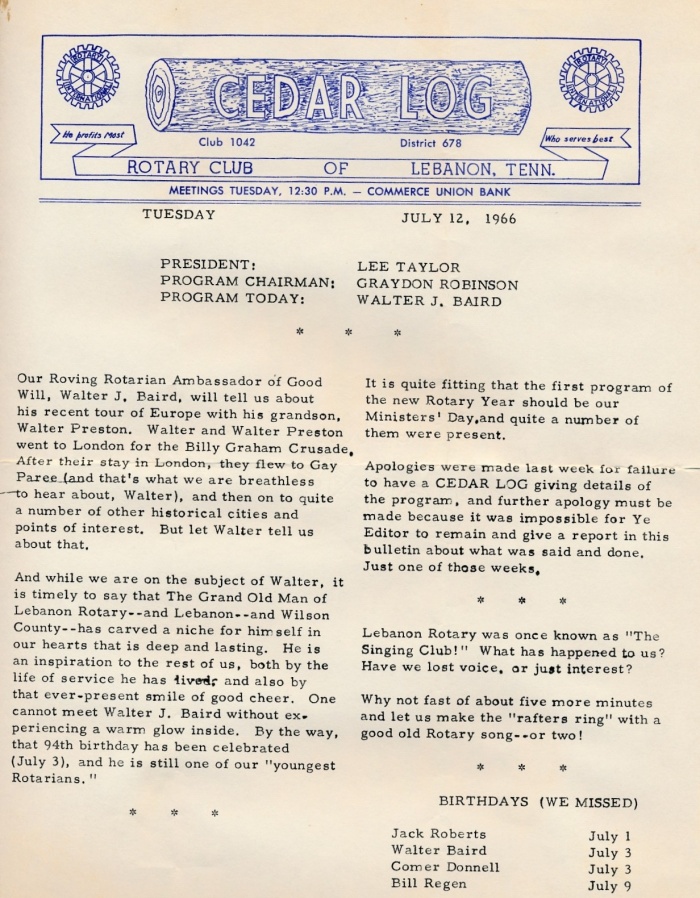 July 12, 1966 Cedar Log with Program Speaker (member) Walter J. Baird (1966-1967).