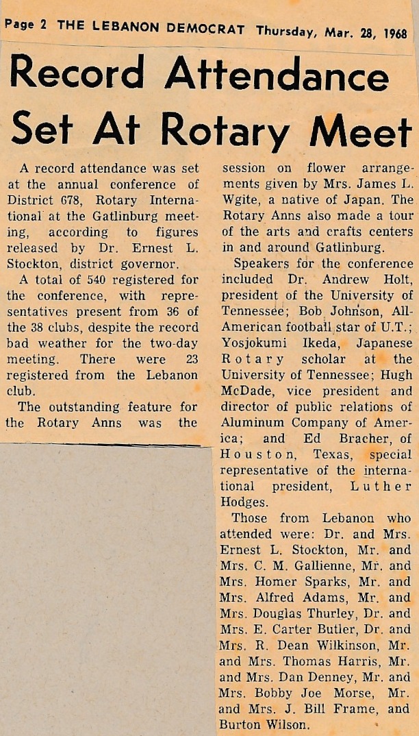1967-1968 Club Attendees to the Annual District 678 Conference in Gatlinburg, TN (1967-1968). |