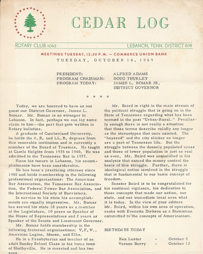 October 14, 1969 Cedar Log with Program Speaker James L. Bomar, Jr., District Governor (1969-1970). |