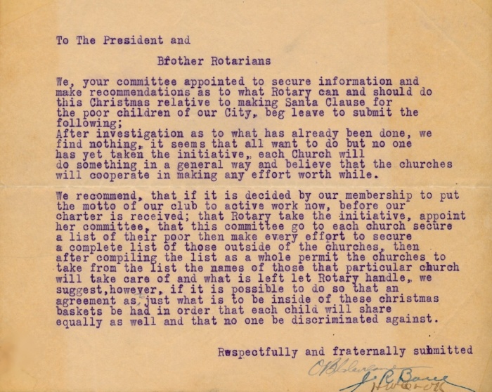 Even before the club was officially chartered in December 1921, the members had already launched its first service project, annual Christmas Baskets. This tradition continues 104+ years later! |