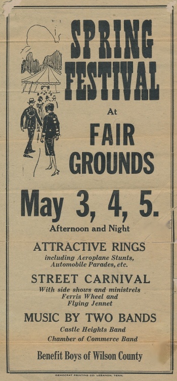 In 1928 and 1929, the club sponsored a Spring Festival to benefit the "Boys of Wilson County". This is 1928's flyer. |