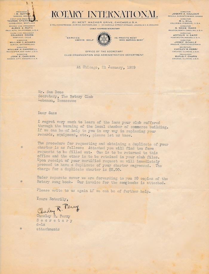 January 21, 1929 letter to Rotary International requesting a duplicate charter. Original was lost in fire at the Chamber of Commerce (club's meeting space) in the Arcade on the Square. See response below.