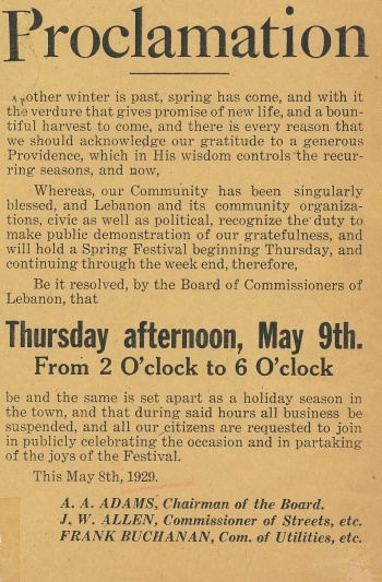 The Lebanon Board of Commisioners' resolution that all business shall cease in order to celebrate the 1929 Spring Festival. |