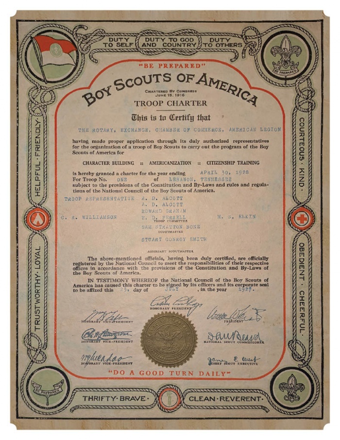 The Rotary Club of Lebanon, with the Exchange Club, the local American Legion post and the Lebanon Chamber of Commerce sponsor/charter the first Boy Scout troop in Lebanon and Wilson County (July 23, 1927). |