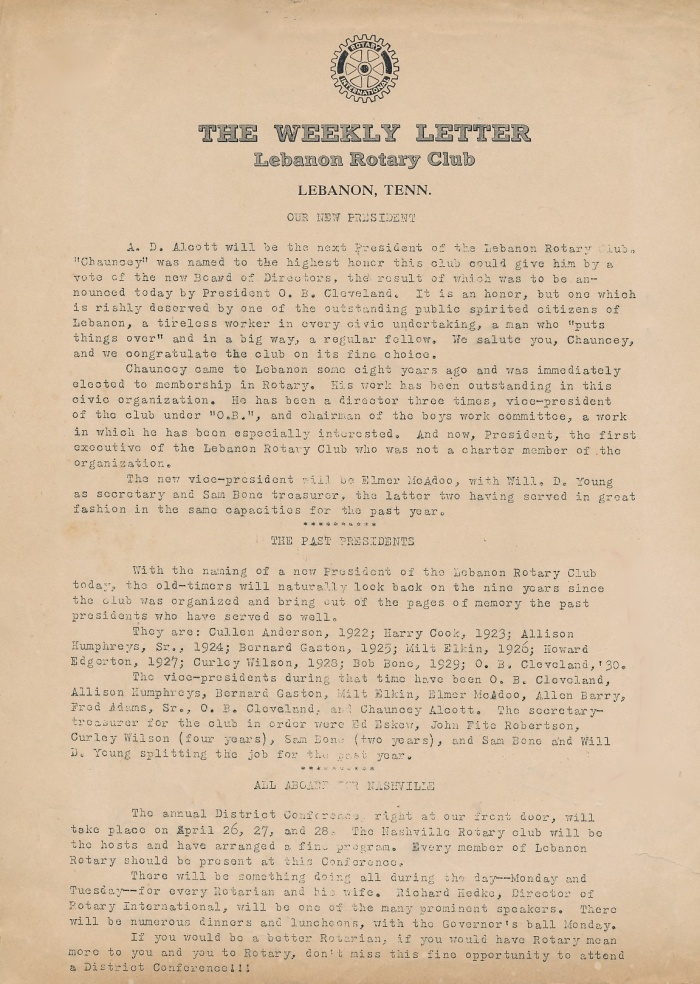 The Club's "The Weekly Letter", dated December 10, 1930. Note that a "Ladies Night" is proposed to celebrate the club's upcoming 9th birthday. An annual "Ladies Night" became an annual tradition until women became club members in August 1996. Also note in the "Letter" that Cumberland University had recently joined the "Southern Association of Colleges". |