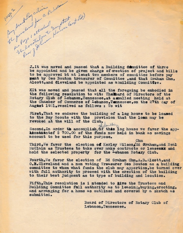 Board resolution to record that on August 27, 1931, the Club's Board of Directors approved a plan to fund the building of or acquiring a log cabin which would then be loaned to the local chapter of the Boy Scouts for their use. Page 1 above; page 2 is below. |