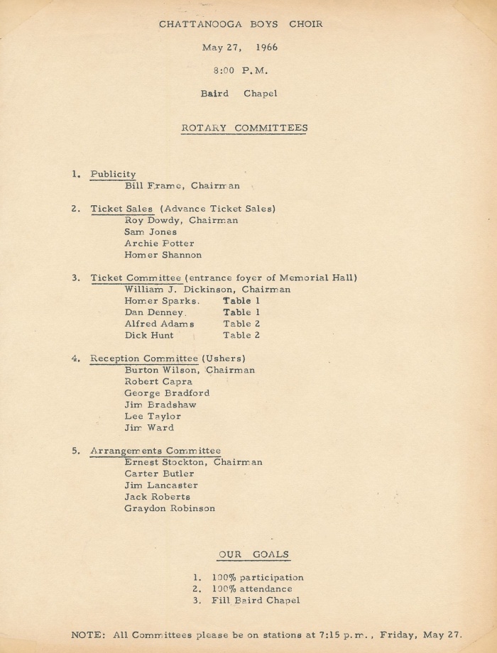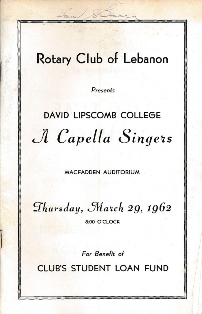 The Rotary Club of Lebanon sponsors the David Lipscomb College "A Capella Singers" at Castle Height's McFadden Auditorium to support the Club's Student Loan Fund (1961-1962). |