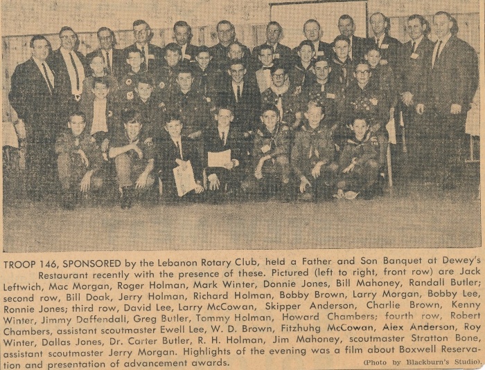 Lebanon's Boy Scout Troop 146 and its Father and Son Banquet at Dewey's Restaurant. Glossy photo below (1963-1964). |