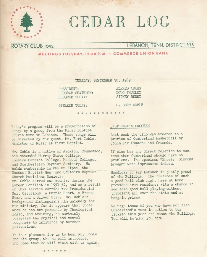 September 30, 1969 Cedar Log and the first appearance at the Rotary Club of Lebanon by H. Bert Coble (1969-1970). Future Club President and District Governor of District 6780. |